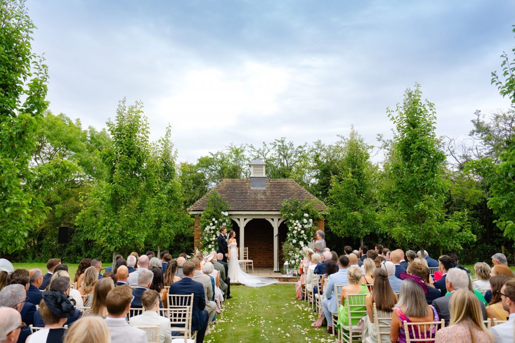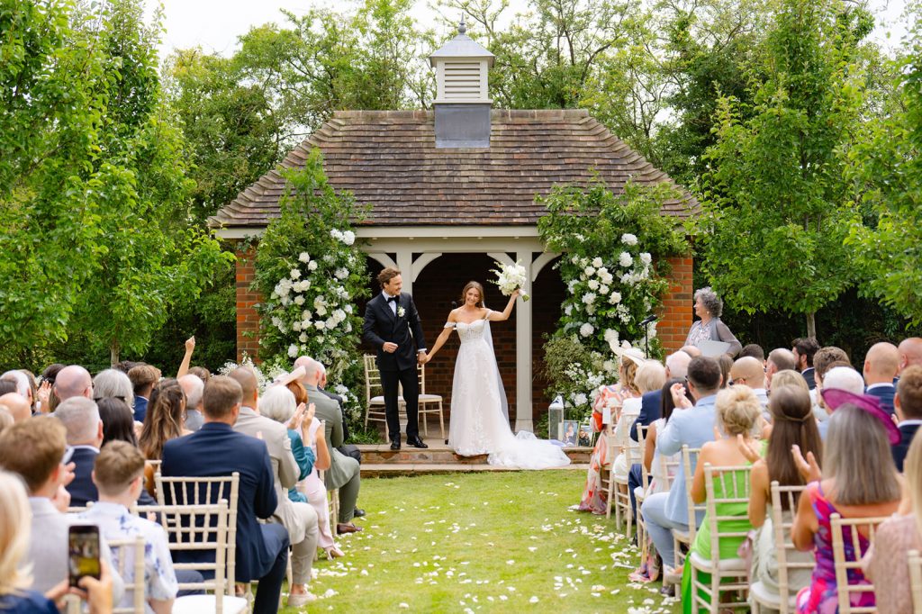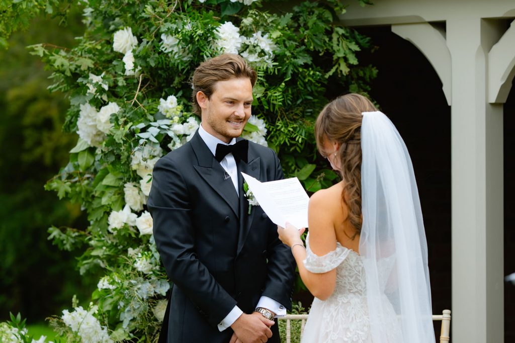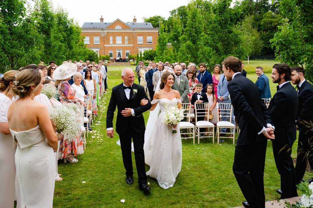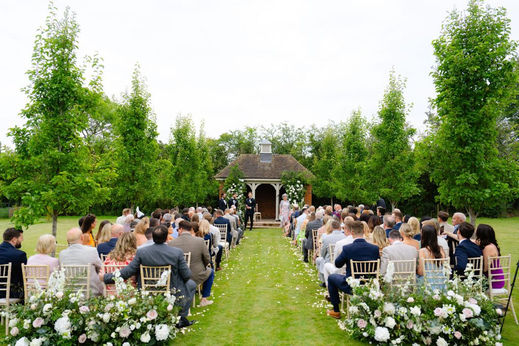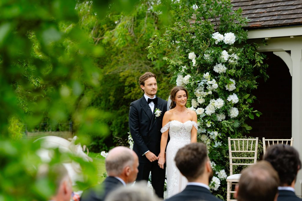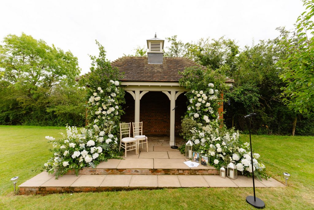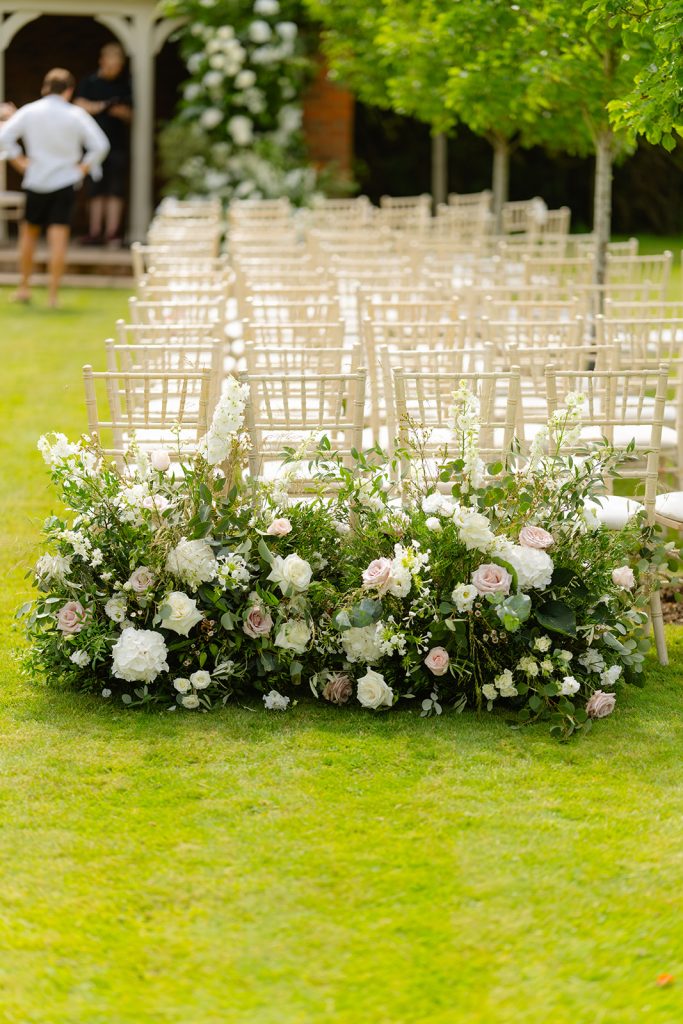Laura & Dan exchanged vows in front of their family and friends on a beautiful summers day in August. Dan’s parent’s garden was the perfect setting for the occasion. The ceremony took place in-front of the folly at the bottom of the garden, where we created two oversized floral column arrangements with large branches of oak and pittosporum, plenty of hydrangeas and large headed playa blanca roses, finished with a meadow effect of delphiniums at the base. The start of the aisle was framed with large meadow arrangements.