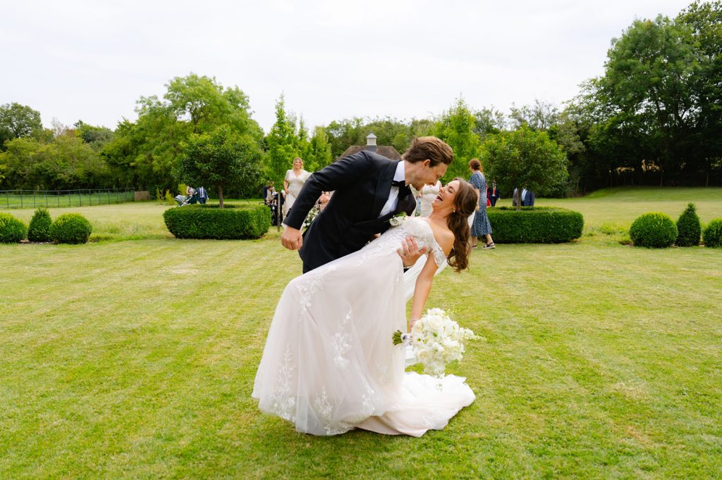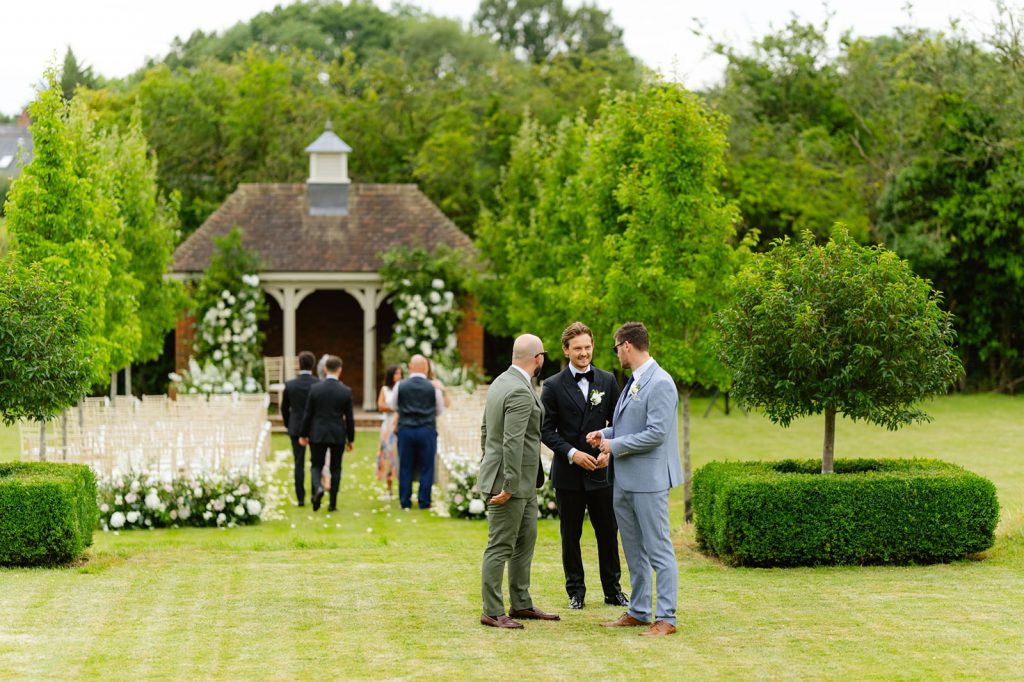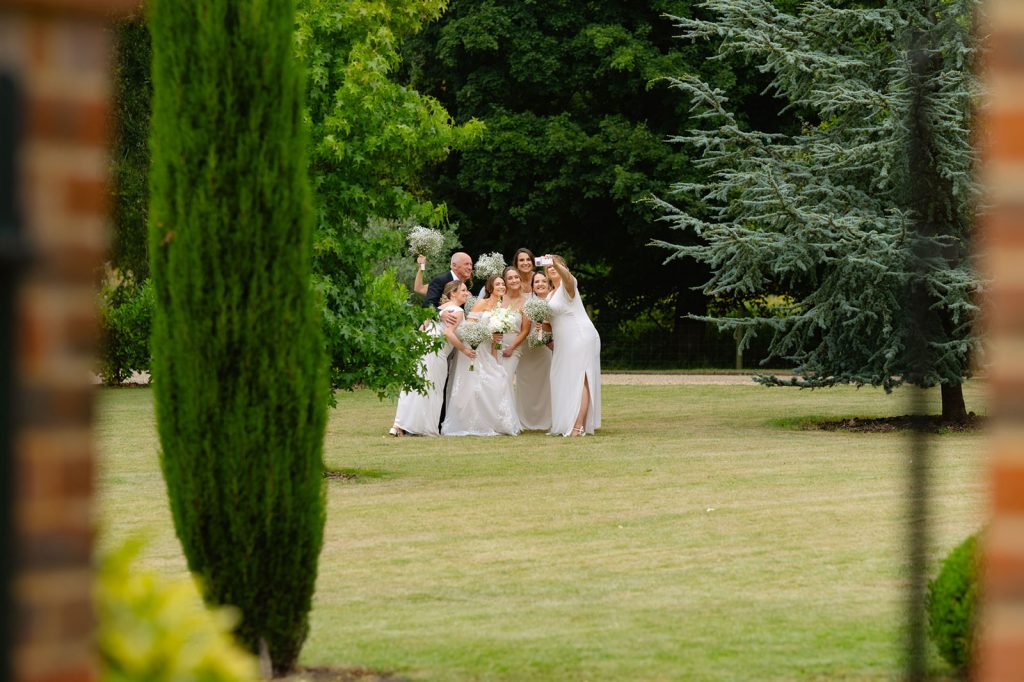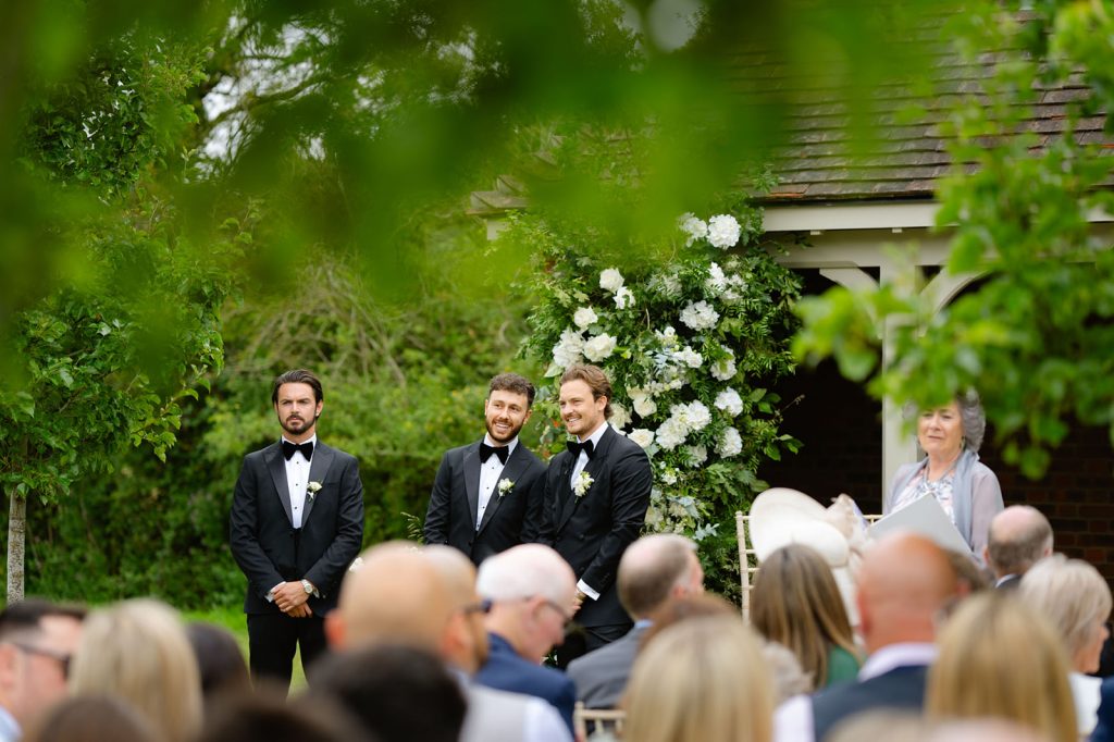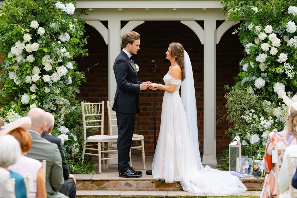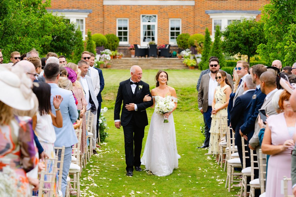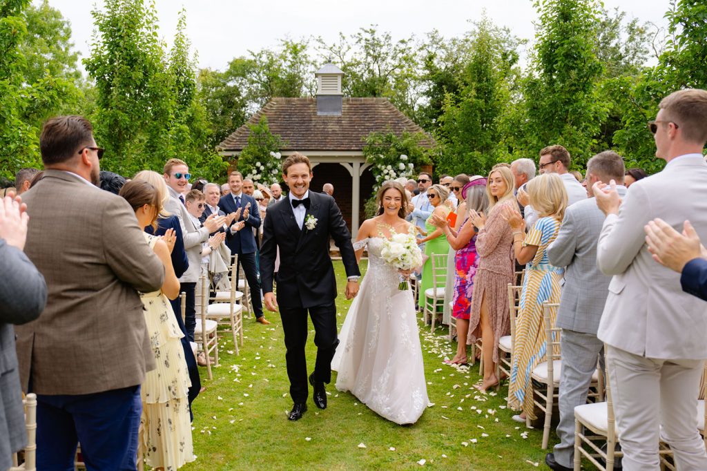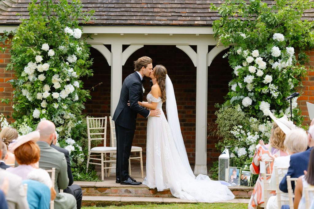 Laura & Dan exchanged vows in front of their family and friends on a beautiful summers day in August. Dan’s parent’s garden was the perfect setting for the occasion. The ceremony took place in-front of the folly at the bottom of the garden, where we created two oversized floral column arrangements with large branches of oak and pittosporum, plenty of hydrangeas and large headed playa blanca roses, finished with a meadow effect of delphiniums at the base. The start of the aisle was framed with large meadow arrangements.