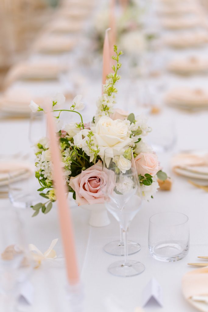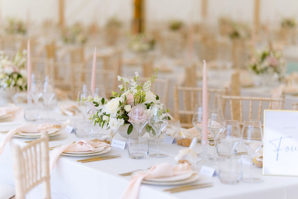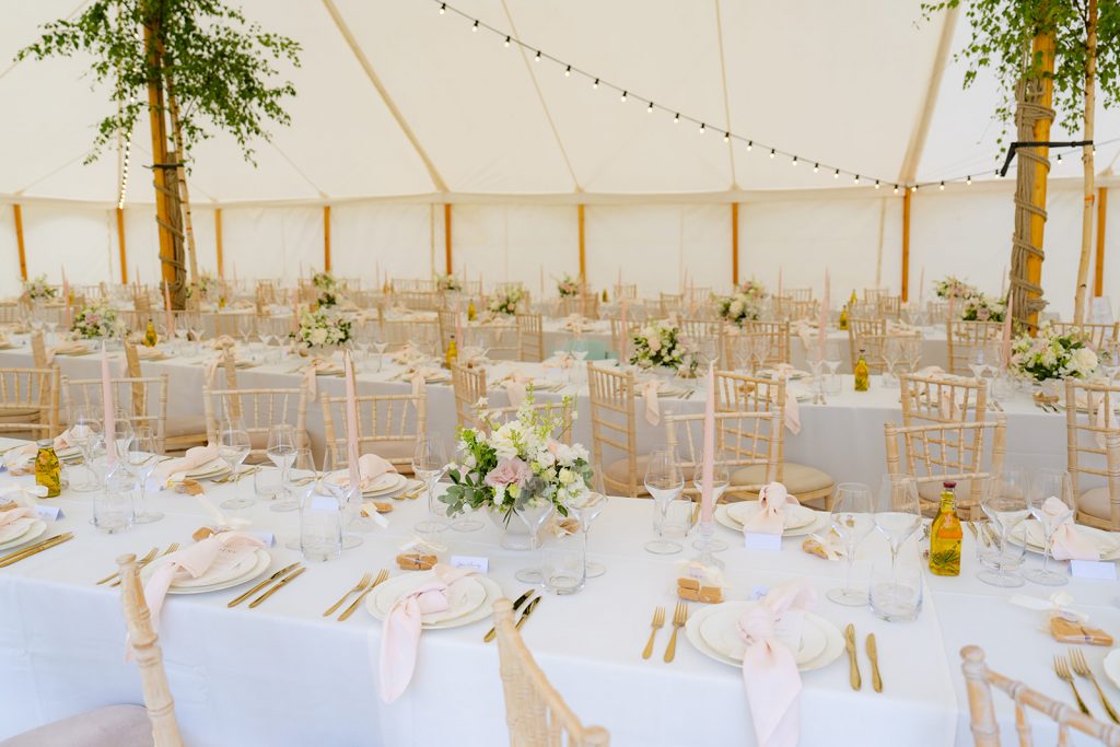 The reception was held in a beautiful sail cloth marquee. The tables were laid in long banqueting style through one end of the marquee. These were decorated with gorgeous compote bowls full of scented blooms, such as roses and sweet peas. The blush was accented with taper dinner candles and napkins.