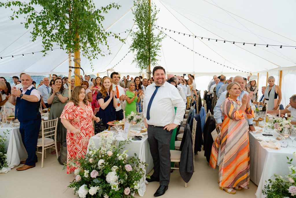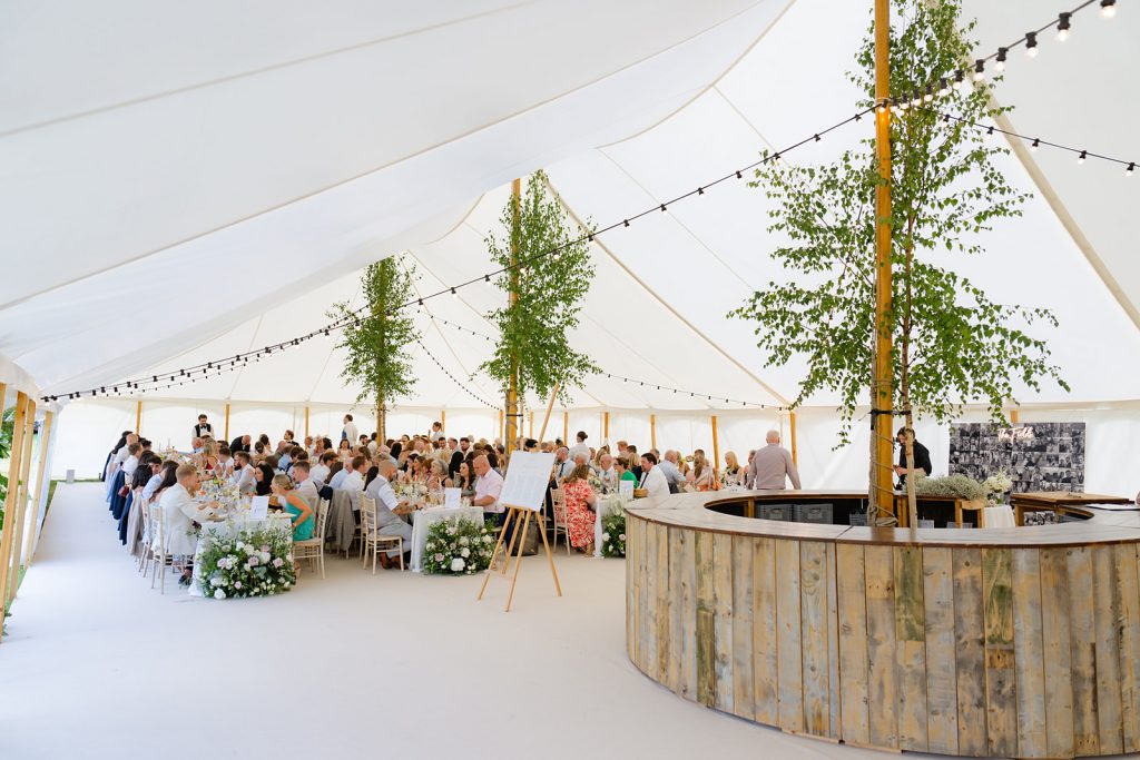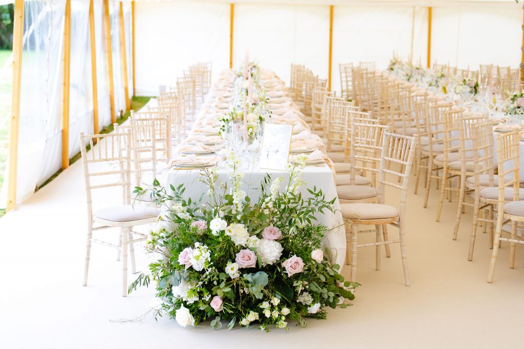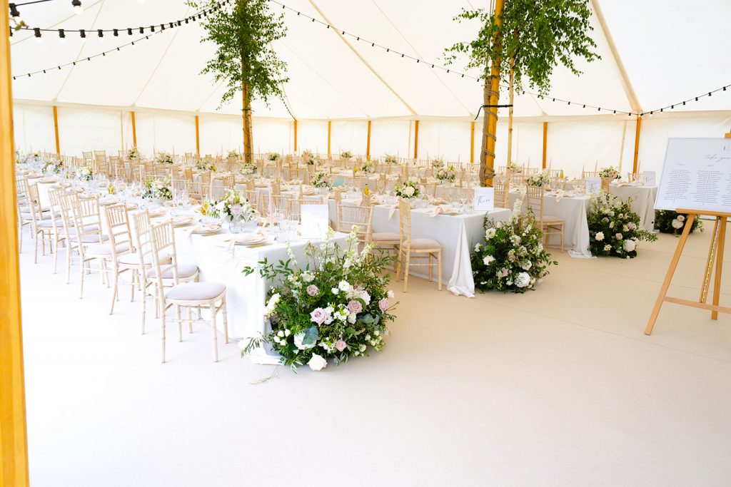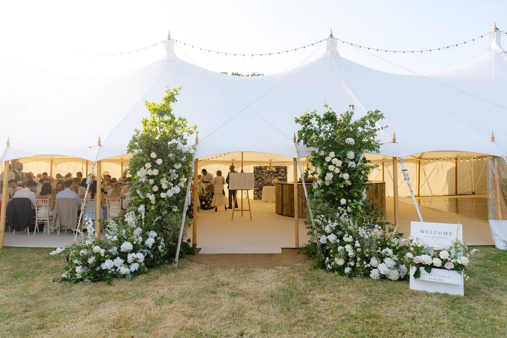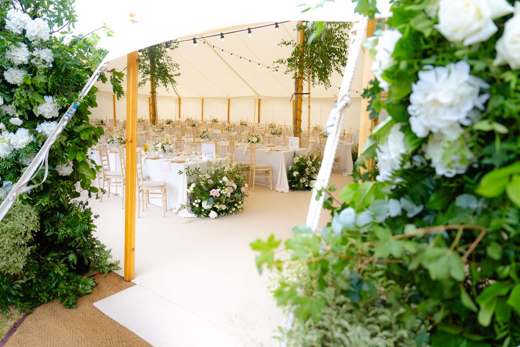 Once the ceremony was over and all the guests were enjoying a cold glass of fizz, we moved the floral columns to frame the entrance of the marquee. The meadows were also moved and placed at the end of each of the trestle tables.